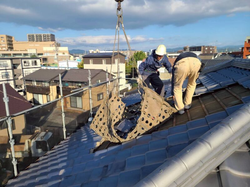 大型クレーンを使って、外した屋根瓦を下ろします