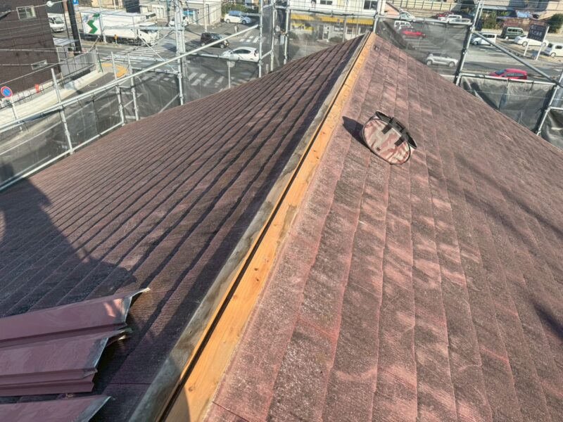 既存の棟木を交換するため、棟板金を外します。