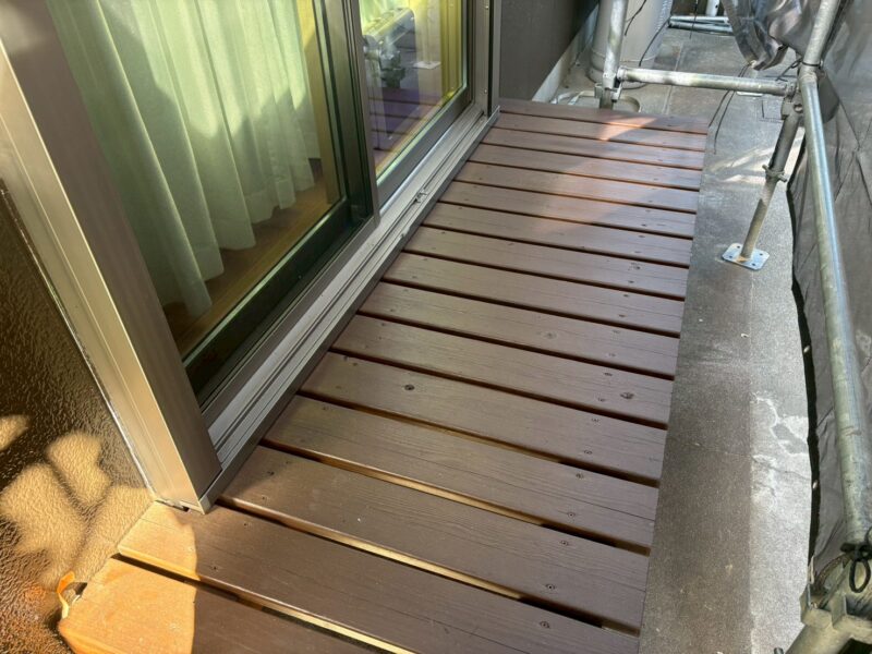 土の撤去後に綺麗に掃除をし、コンパネを貼ります。既存の下地根太がきれいで使えるため、根太の上にコンパネを敷き詰めます。
